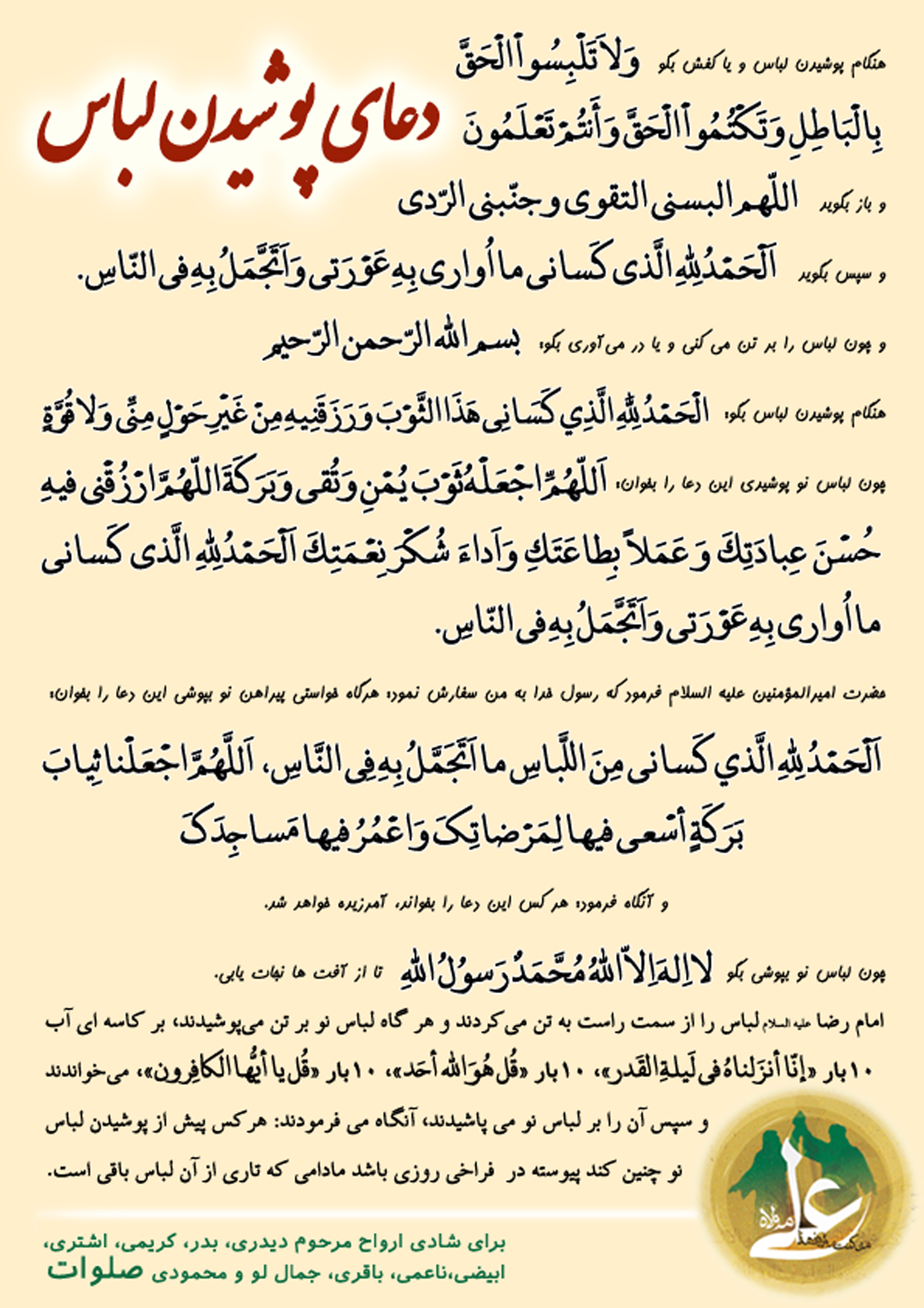فایل ورد دعاهای آویختنی را می توانید از اینجا دانلود کنید. پرینت پشت و رو باید گرفته شود و حاشیه سفید بریده شود و به گردن آویخته شود.