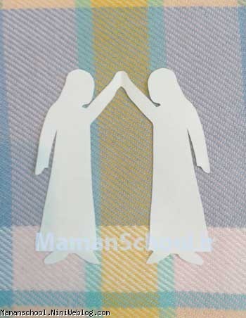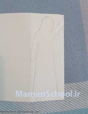 7- برای کشیدن حضرت رسول (ص) و امام علی (ع) ، فقط یکبار کاغذ را تا می زنیم. و شکل مورد نظر (مانند شکل پایین) را روی آن می کشیم به گونه ای که قسمت دستی که بالا است روی قسمت تای کاغذ بیفتد.
