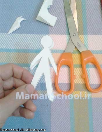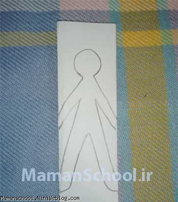 4- شکل آدم مورد نظر را روی کاغذ می کشیم به گونه ای که دست ها و پاهای آن به دو لبه ی کاغذ چسبیده باشد.
